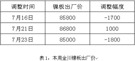 本周外盘先涨后跌,金川公司两次调整镍板出厂价,较上周累计下调800元/吨。国内镍板价格较上周下跌2200元/吨,俄罗斯镍板下跌1400-17000元/吨。本周镍市低位反弹,贸易商周一见镍价企稳,买货意愿较好,之后担心镍价涨势的持续性,,后半周伦镍偏弱,商家买涨不买跌,买货意愿下降,整体成交偏淡。