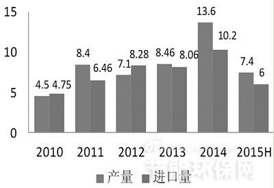 2010~2015年我国多晶硅生产和进口情况(单位:万吨)