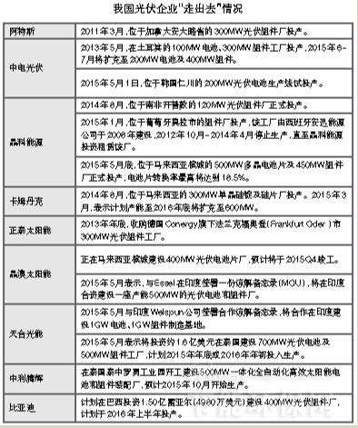 欧美“双反”加快了我国光伏企业走出去步伐。截至2015年上半年,据不完全统计,我国已建成投产海外电池与组件产能分别达到800MW与1.5GW,在建及扩建产能分别达到3.2GW与3GW。与此同时,我国主要光伏企业也在积极扩充国内组件产能。据Energy Trend统计,2015年多家中国企业已宣布扩产计划,将新增4.2GW组件产能,其中海外组件产能将新增1GW。