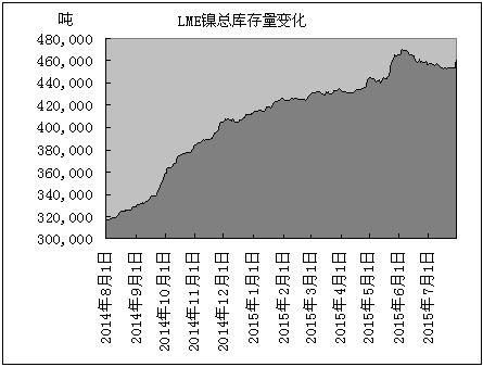 6月初LME镍库存达到创纪录的47.04万吨后,持续减少。7月份大部分时间内,镍库存是减少的,最低减少至28日的45.3万吨。不过月底最后几天,库存再度急速飙升至46万吨上方。综合目前情况看,未来一段时间内库存仍将对镍价构成一定压制。目前属于季节性消费淡季,北半球处于夏季,下游停产减产检修设备的工厂较多。另外一方面,国际大型绿地镍项目仍处于产能利用爬升期。预计未来一段时间镍库存难以持续大幅减少的情况。