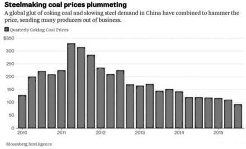 在过去一年里,随着中国房地产泡沫破裂以及影子银行系统发展滞缓,来自中国的大宗商品需求严重下降。煤炭价格暴跌只是众多商品价格崩溃的表现之一。据行业咨询公司环球钢讯(SteelBusinessBriefing)的统计,今年以来,澳洲出口煤炭的基准价格已下跌至85.40美元/吨,跌幅达24%。而在2011年,季度基准价格曾一度到达330美元/吨。下图为炼焦煤季度价格,可以看出,在2011年达到峰值后,随着中国钢铁需求下降,炼焦煤价格也开始出现下跌。
