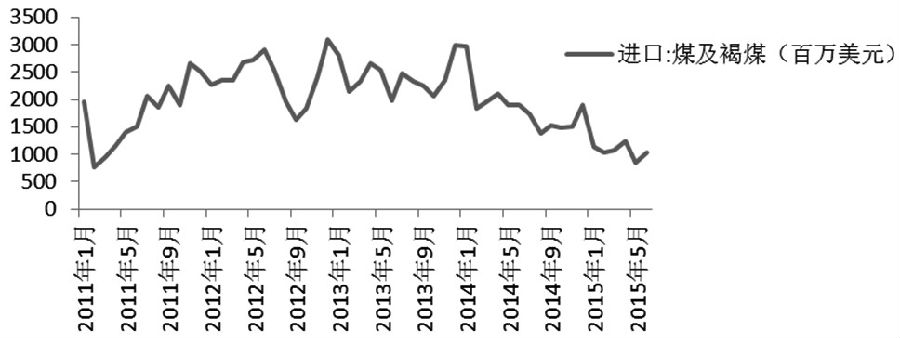据中国海关总署的数据显示,中国前5个月的煤炭进口量达8326万吨,相比去年下降了38.2%。5月进口量相比4月份下降了28.6%,而相比2014年5月,进口量则下降了40.6%。下图显示了自2011年至2015年6月,中国煤炭进口额的变化情况。可以明显看出,自2014年开始,煤炭进口出现下降趋势。