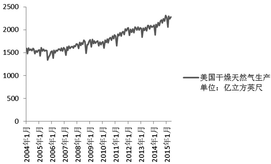 下图为1997年1月至2015年1月美国干燥天然气产量情况,可以看出,美国天然气生产持续增加,尽管如今钻机数量有所下降,但产量增长仍在继续。