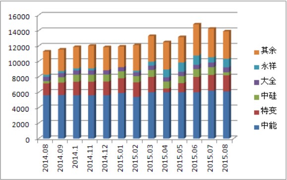 图2 2014年8月-2015年8月国内多晶硅分企业产量图单位:吨