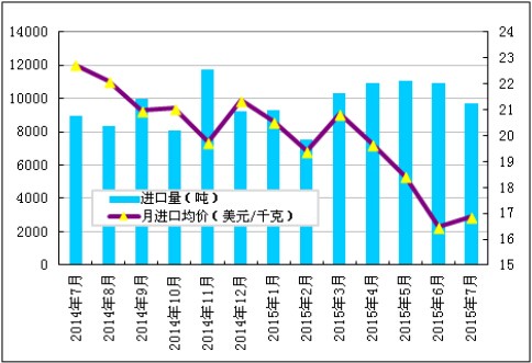 图32014年7月-2015年7月多晶硅进口量及进口均价示意图