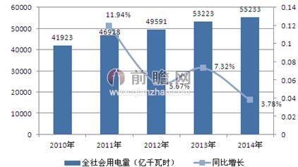 前瞻产业研究院发布的《2015-2020年中国售电公司发展模式与投资战略规划分析报告》指出:我国售电市场其全国平均销售电价为0.492元/千瓦时,2014年我国全社会用电量为5.52万亿千瓦时,简单测算全国售电市场容量为2.72万亿元,如果剔除第一产业和城乡居民用电后,市场容量约为2.3万亿元。2013年,国内全社会用电量累计5.32万亿千瓦时,同比增长7.5%。2014年,全国全社会用电量55233亿千瓦时,同比增长3.8%。