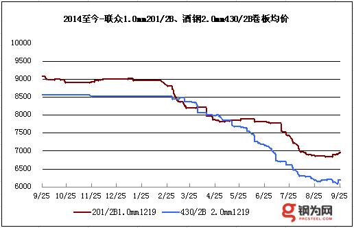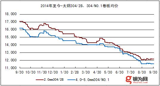 据钢为网监测数据显示:截至9月30日,太钢、宝钢产2.0 mm 304/2B不锈钢卷板均价12138元/吨,环比上涨44元,无锡市场报11950元/吨跌50,淄博报价12400元/吨涨100,佛山报价11850元跌50。4.0-5.0mm 304/NO.1不锈钢卷板均价11544元/吨,环比跌6元。无锡市场目前报11500元/吨;佛山报11650元涨150;上海报11400元跌150。