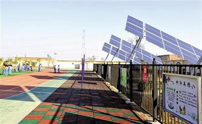 永宁县闽宁镇振发希望小学操场边的光伏板格外醒目(11月11日摄)。该校建成十多年来,一直采用分散采暖煤炉供暖,改用光伏发电带动中央空调取暖后,不仅解决了冬季供暖问题,剩余电量并网还能为学校每年创收5万元。