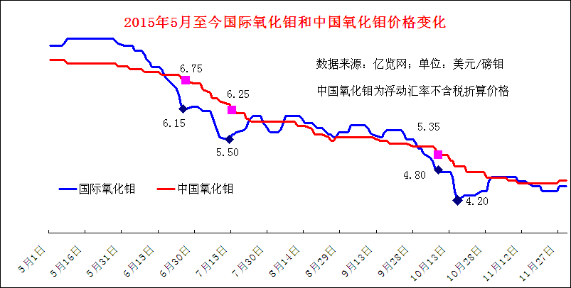 根据历史数据,自2015年5月份以来,国际氧化钼分别在跌至6.15美元/磅钼、5.5美元/磅钼、4.8美元/磅钼、4.2美元/磅钼之时分别有稍显活跃的四次进口,期间中国部分钼企业采购了少量的国际氧化钼,以亚洲港口现货为主。