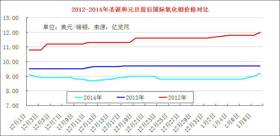 从趋势来看,2012年国际氧化钼在进入12月份保持涨势,且上涨一直持续到元旦假期之后。2013年在圣诞之前有过一段时间的上涨,但进入圣诞假期期间和之后,价格便进入平稳运行状态。2014年虽然价格有小幅上涨,但圣诞假期之时有所回落,在元旦之后出现小幅上涨。