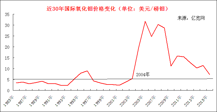 从上图可以看出,在2003年以后,国际氧化钼价格一直处于较高水平,而2015年钼价格再一次跌至5美元/磅钼价位,相当于回到了12年前的水平。
