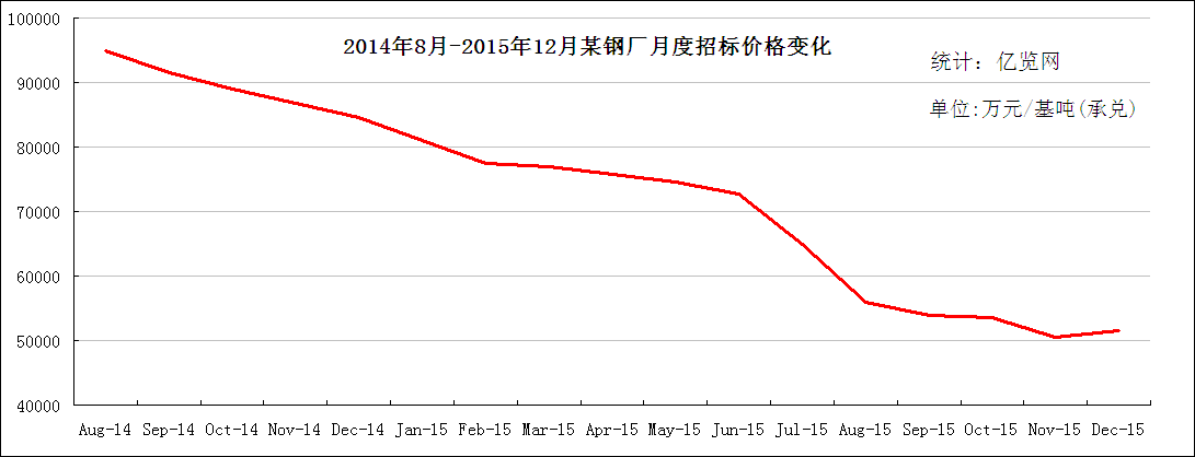 根据亿览网统计数据显示,该钢厂2014年8月份招标钼铁价格为95000元/基吨,2015年11月份招标钼铁价格为50500元/基吨,15个月内下滑幅度达到46.8%,接近一半。