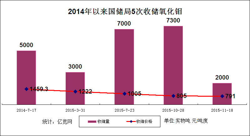 2015年10月份和11月份期间国储局再分两次进场收储氧化钼,最终收储总量为7300吨,交货期为2016年第一季度,收储价格分别为805元/吨度和791元/吨度。