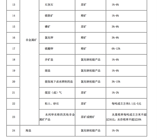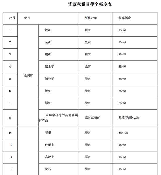 1.对《资源税税目税率幅度表》(见附件)中列举名称的21种资源品目和未列举名称的其他金属矿实行从价计征,计税依据由原矿销售量调整为原矿、精矿(或原矿加工品)、氯化钠初级产品或金锭的销售额。列举名称的21种资源品目包括:铁矿、金矿、铜矿、铝土矿、铅锌矿、镍矿、锡矿、石墨、硅藻土、高岭土、萤石、石灰石、硫铁矿、磷矿、氯化钾、硫酸钾、井矿盐、湖盐、提取地下卤水晒制的盐、煤层(成)气、海盐。