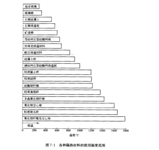 (2)按使用温度分:使用温度低于900℃的为低温隔热耐火材料,如硅藻土砖;使用温度为900-1200℃的为中温隔热耐火材料,如轻质黏土砖,硅酸铝纤维制品等;使用温度高于1200℃的为高温隔热耐火材料,如轻质硅砖,氧化铝空心球砖等。各种隔热耐火材料的温度如图所示。