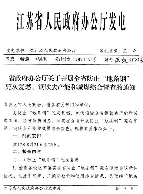 近日,江苏省政府办公厅印发《关于开展全省防止“地条钢”死灰复燃、钢铁去产能和减煤综合督查的通知》(以下简称"《通知》")。《通知》称,江苏省此次督查于8月21日~25日开展,主要督查内容如下: