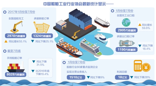 中国船舶工业行业协会最新统计显示,2017年1月份至7月份,全国造船完工2978万载重吨,同比增长55.1%。承接新船订单1324万载重吨,同比下降25.1%。截至7月底,手持船舶订单8028万载重吨,同比下降31.5%,比2016年底下降19.4%。