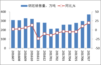图1重点钢铁企业钢坯销售量及同比