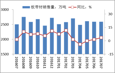 本月,重点钢铁企业销售板带材2593.07万吨,比去年同期增加88.77万吨,上升3.54%;截止本月,本年累计销售板带材18081.73万吨,累计比去年同期增加515.78万吨,上升2.94%。