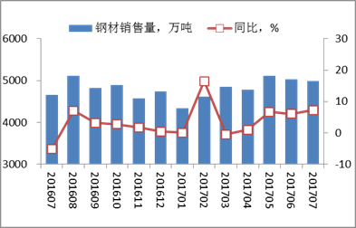 本月,重点钢铁企业销售钢材4988.62万吨,比去年同期增加335.77万吨,上升7.22%;截止本月,本年累计销售钢材33729.06万吨,累计比去年同期增加1613.99万吨,上升5.03%。