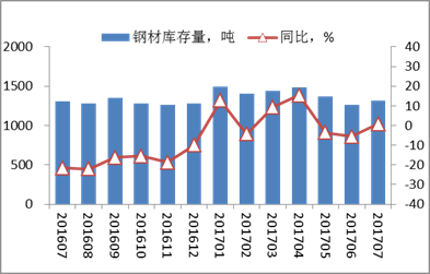 图7重点钢铁企业各月末钢材库存量及同比