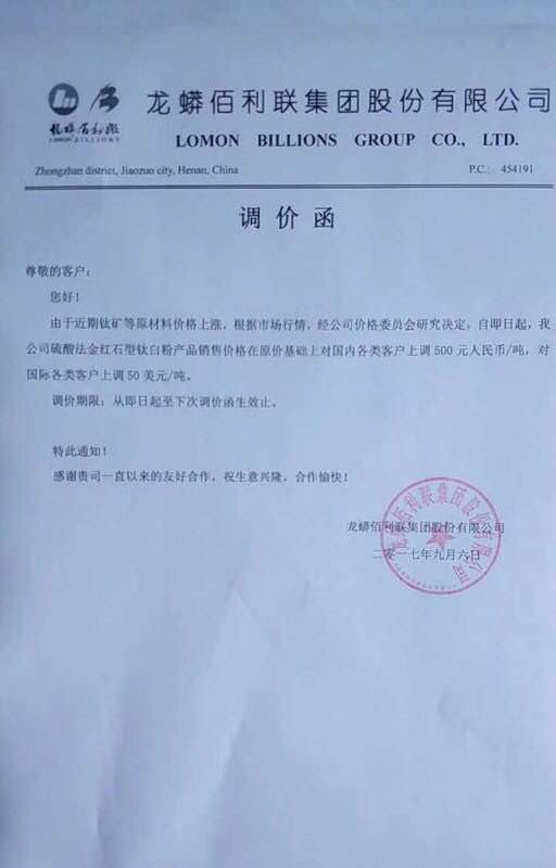 :钛 龙蟒 佰利联 钛白粉 调价函
