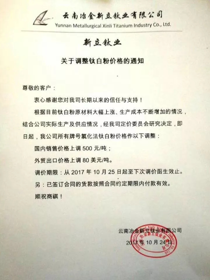 10月24日,云南冶金新立钛业有限公司发布钛白粉调价通知,根据目前钛白粉原材料大幅上涨,生产成本不断增加的情况下,自10月25日期,公司所有牌号氯化法钛白粉价格国内上调500元/吨,外贸上调80美元/吨。