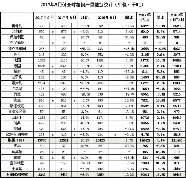 1月~9月份,全球累计粗钢产量为12.67亿吨,同比增长5.2%。其中,亚洲的粗钢产量为8.76亿吨,同比增长5.3%;欧盟的粗钢产量为1.26亿吨,同比增长4.3%;北美洲的粗钢产量为8671万吨,同比增长3.5%;南美洲的粗钢产量为3234万吨,同比增长8.0%;中东地区的粗钢产量为2450万吨,同比增长14.2%;独联体的粗钢产量为7637万吨,同比持平。