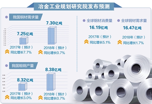 近日,由冶金工业规划研究院举办的2018中国和全球钢铁需求预测研究成果、钢铁企业竞争力评级发布会在北京召开。根据国内外经济发展形势以及国内下游行业的发展特点,冶金工业规划研究院预测,2017年我国钢材需求量为7.25亿吨,同比增长7.7%;2018年我国钢材需求量为7.30亿吨,同比增长0.7%。