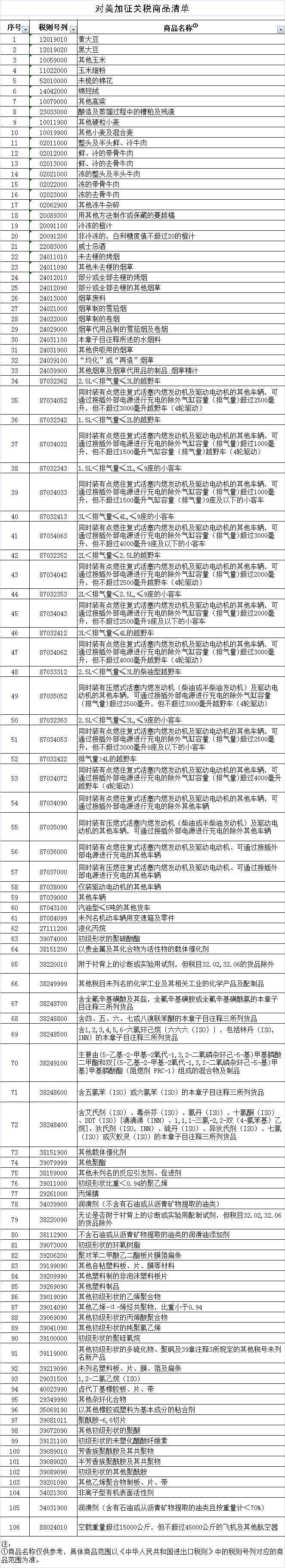 根据《中华人民共和国对外贸易法》和《中华人民共和国进出口关税条例》相关规定,经国务院批准,国务院关税税则委员会决定对原产于美国的大豆、汽车、化工品等14类106项商品加征25%的关税。实施日期将视美国政府对我商品加征关税实施情况,由国务院关税税则委员会另行公布。