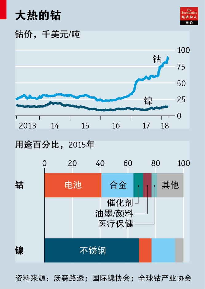 由此推高的价格最终将会打开新的供应源。但是,中国以外的电池制造商已在想方设法让自己免受可能的钴短缺之苦。目前它们想到的妙方是另一种“鬼怪金属”——钴的亲密战友镍。“镍”的英文名称源于德国一个与撒旦(Old Nick)密切相关的鬼怪。