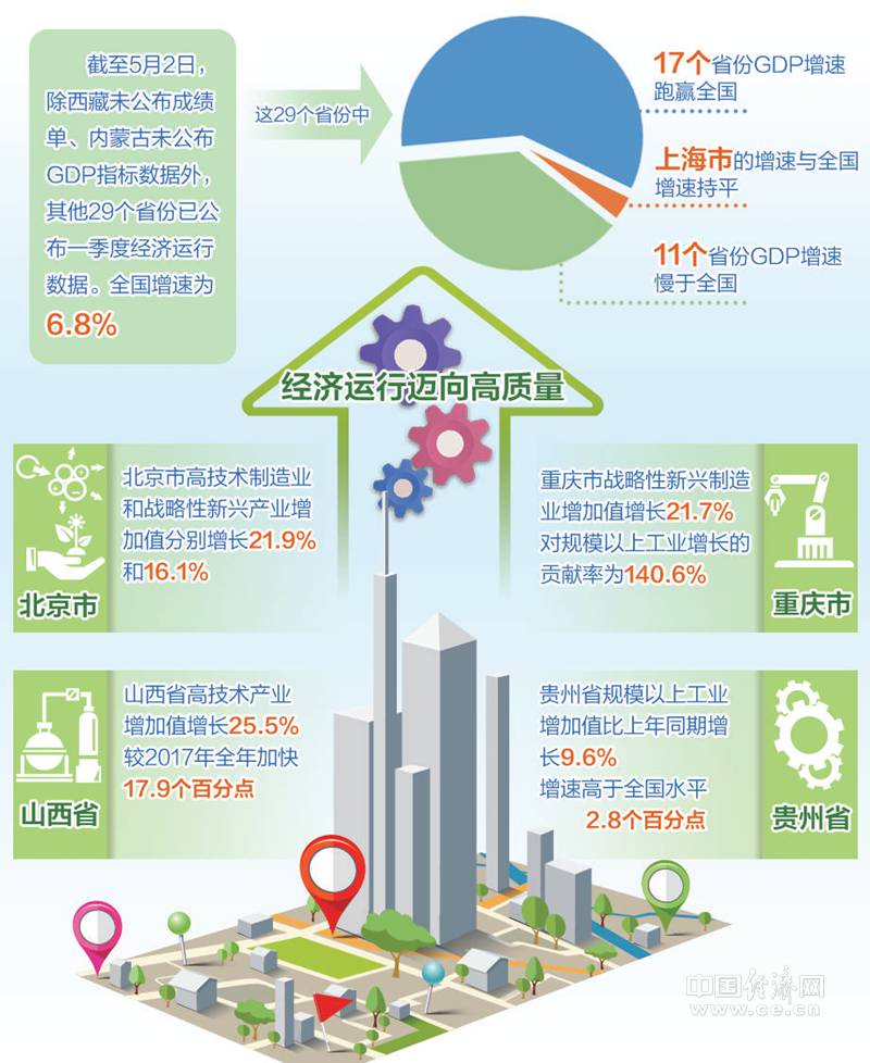 截至5月2日,除西藏未公布成绩单、内蒙古未公布GDP指标数据外,其他29个省份已公布一季度经济运行数据。其中,17个省份GDP增速跑赢全国增速,贵州增速为10.1%,处于领跑位置;11个省份GDP增速慢于全国增速,天津增速仅为1.9%;上海的增速为6.8%,与全国增速持平。