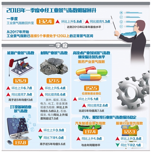 由经济日报社中国经济趋势研究院、国家统计局中国经济景气监测中心、中国社科院数量经济与技术经济研究所共同编制的2018年一季度中经产业景气指数今日发布。本季度中经产业景气指数所采集的具有代表性行业和领域共14个,既包括煤炭、石油、电力、钢铁、有色金属、非金属矿物制品、化工、汽车制造、IT设备制造、医药、服装11个具体行业,同时又涵盖能源、材料和工业3个综合性领域——