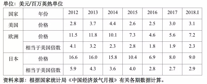 如表1所示,从2012年至2018年第一季度,欧洲天然气价格相当于美国天然气价格的1.8—4.1倍,东亚价格(以日本价格为基准)相当于美国的2.7—5.9倍。