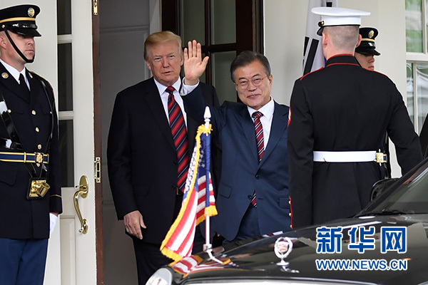 5月22日,美国总统特朗普(左二)在华盛顿白宫欢迎到访的韩国总统文在寅(左三)。 新华社记者杨承霖摄