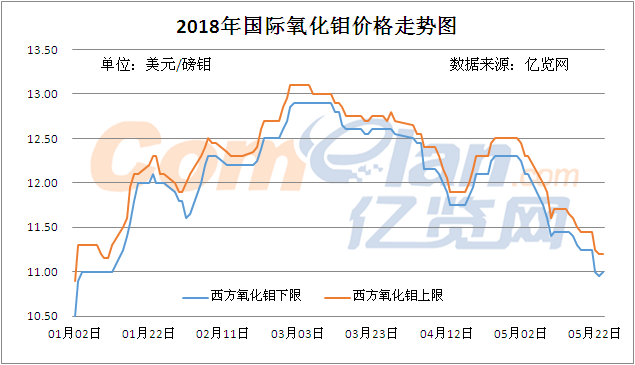 近日国际氧化钼实际交易价格已低于11美元/磅钼,也是2018年1月3日之后首次跌破11美元/磅钼,今日氧化钼报价11-11.2美元/磅钼,较3月初13美元/磅钼累计跌幅15%。