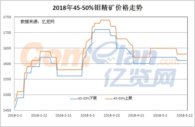18年开局中国钼市一路走高,国内钼精矿价格在3月中旬冲至高点,45-50%市场交易价格一度站在1700元/吨度以上,随着谨慎心态渐生买盘逐步清淡,钼精矿交易价格出现下跌,随着交易价格跌破1650元/吨度,价格基本稳定,市场逐步步入僵持盘整局面,4月份到现在,中国45-50%钼精矿在1600-1650元/吨度之间已盘整近两个月。