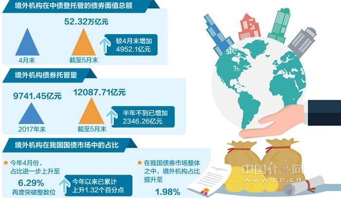 据中债登月报显示,截至5月末,境外机构在中债登托管的债券面值总额达52.32万亿元,较4月末增加4952.1亿元。截至5月末,境外机构债券托管量为12087.71亿元,相比于2017年末的9741.45亿元,半年不到已增加2346.26亿元,境外机构增持境内债券的力度明显加大。