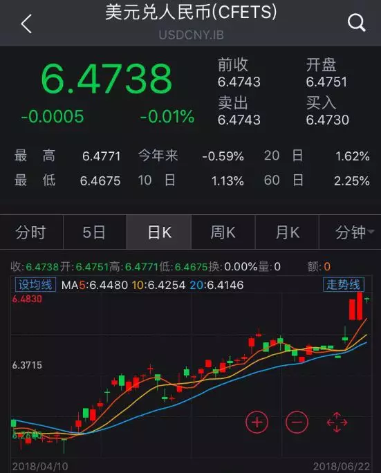 从4月2日,中美拉开贸易战序幕之后,人民币在案汇率已经从6.2784,一路贬值到昨天的6.4902,在不足3个月时间里,人民币已经贬值了2118个基点。