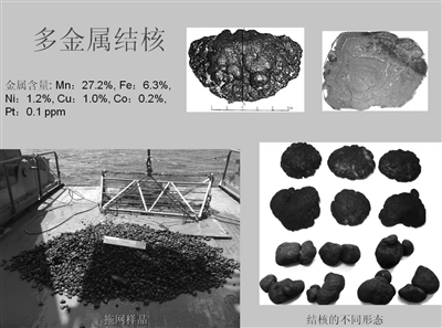 在4000——5000米深的大洋盆地表面,像铺地毯一样普遍铺着一层锰结核;在一些海底山表层也分布有一层平均数厘米厚的锰结壳。它们含铜、镍、钴等多种金属元素。世界洋底的锰结核总量约3万多亿吨,其中太平洋底最多,约1.7万亿吨,含锰4000亿吨、镍164亿吨、铜88亿吨、钴58亿吨。这些储量相当于目前陆地锰储量的400多倍,镍储量的1000多倍,铜储量的88倍,钴储量的5000多倍。