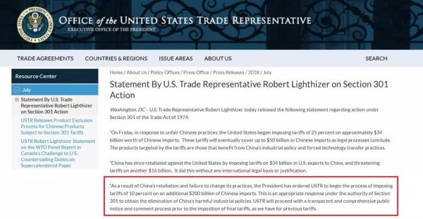 第二,强调中国不听劝,未按其要求“限期整改”——声明称,过去一年,特朗普政府“耐心”敦促中国停止原有做法、开放市场、参与真正的市场竞争,并给出了“清晰和详细”的具体改变要求,但中国“并未改变令美国经济未来处于风险的行为”,反而开始报复美国产品,这样做“缺乏任何国际法理基础或理由”。所以他们觉得,原有的力度不够了,要再加加码,“这是美国在301条款授权下对消除中国‘有害’产业政策做出的合适回应”。(就奇怪怎么这个301条款哪儿哪儿都好使?)