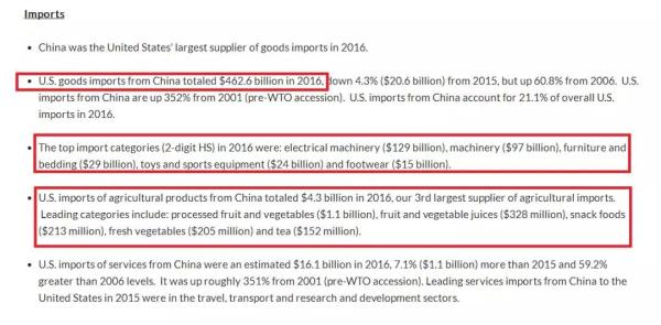 首先,从中方向美方的出口结构来看:2016年美国从中国进口总值4626亿美元,是美国最大的商品供给方。进口额最高的是电子机械类产品(1290亿美元),机器(970亿美元),家具及寝具(290亿美元),玩具及运动装备(240亿美元),鞋类(150亿美元)。此外,从中国进口的农产品总额43亿美元(这已经是美国第三大农产品供应方了),其中占比最高的是加工后的水果及蔬菜(11亿美元),水果及蔬菜汁(3.28亿美元),快餐休闲类食品(2.13亿美元),新鲜蔬菜(2.05亿美元)及茶叶(1.52亿美元)。