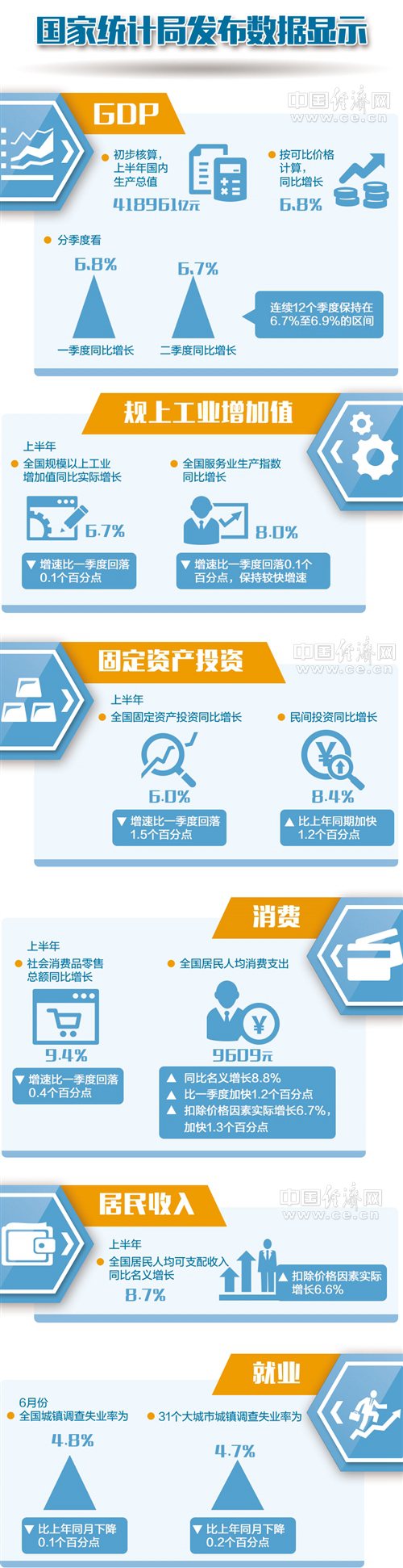 “上半年全国居民人均可支配收入实际增长与经济增长基本同步,按人均计算,高于人均GDP增长速度。”中国国际经济交流中心副总经济师徐洪才表示,今年上半年,受国际贸易、金融市场、地缘政治等因素影响,我国经济运行面临一系列挑战,但世界经济持续复苏,国内新动能不断增强,经济结构继续优化,上半年我国经济运行呈现出“缓中趋稳,稳中向好”特点,支撑居民收入稳定增长。