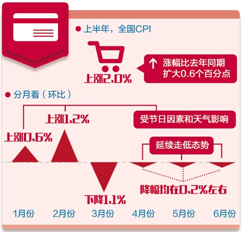 上半年,全国CPI上涨2.0%,涨幅比去年同期扩大0.6个百分点。总体上看,上半年CPI走势比较平稳。