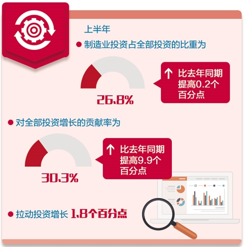 上半年,制造业投资同比增长6.8%,增速比前5个月、一季度分别提高1.6个和3个百分点,比全部投资高0.8个百分点,增速为2016年一季度以来最高。