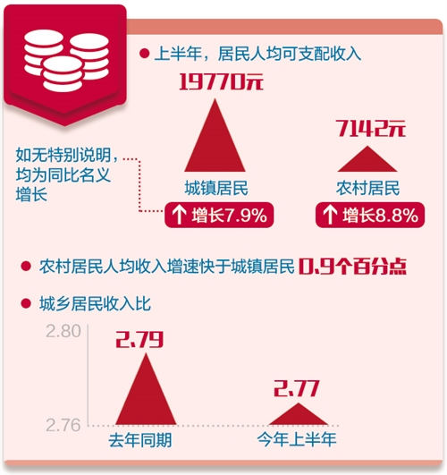 农村居民收入增长快于城镇居民。上半年,城镇居民人均可支配收入19770元,增长7.9%。农村居民人均可支配收入7142元,增长8.8%。