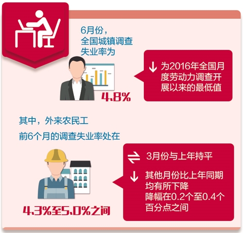 前6个月,全国城镇调查失业率处于4.8%至5.1%区间,总体保持在较低水平,各月均低于上年同期水平。6月份,全国城镇调查失业率为4.8%,为2016年全国月度劳动力调查开展以来的最低值。其中,外来农民工前6个月的调查失业率处在4.3%至5.0%之间,除3月份与上年持平外,其他月份比上年同期均有所下降,降幅在0.2个至0.4个百分点之间。