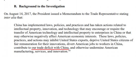 更重要的是,特朗普对中国发动贸易战一个最核心的缘由,是中美间所谓的巨大“贸易逆差”。这也是特朗普对中国发动301调查和贸易战的基础,并清楚地写在美方301调查报告的“背景”一栏中。