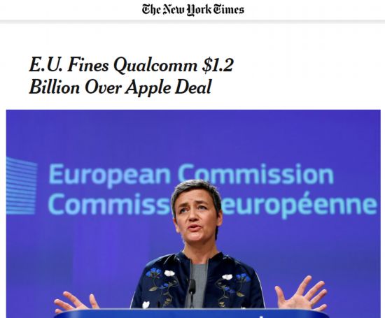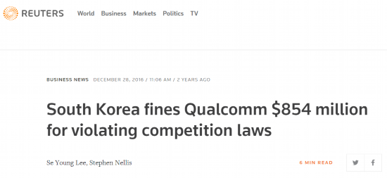 可阿特金森似乎忘了,欧盟今年1月的时候也以违反垄断法为由重罚了高通10多亿美元6,而在2016年的时候高通还被韩国法院罚过8亿多美元7。
