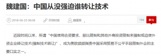 其实,一些外资企业对中国合资企业股比分配的这种不满,才是他们不断“凭空指控”中国存在“强制技术转让”的一个主要由来。同时,中国的快速崛起,特别是科技上的进步,也令这些企业感到他们对于中国的优势在逐步减弱,进一步加剧了他们的焦虑,也令他们对“强制技术转让”的“嚷嚷”变得更加激烈起来。